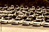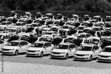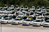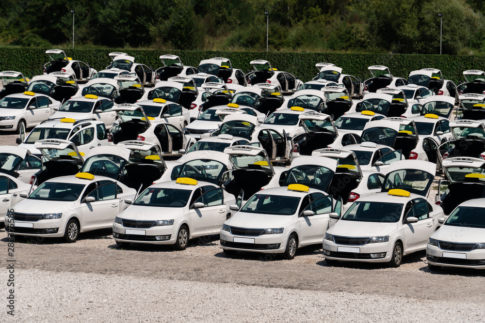 Many taxi cars stand in rows in a parking lot