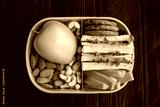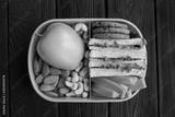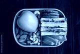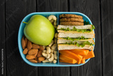 Lunch in the blue box in the center of the black wooden background. Top view. Closeup.