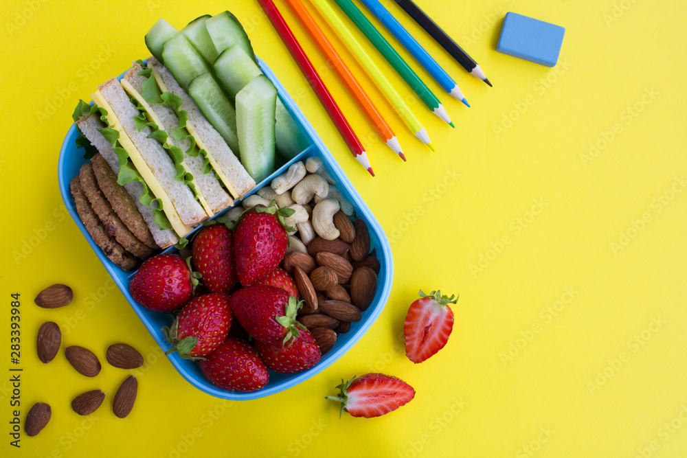 School lunch in the blue box and school stationery on the yellow background. Top view. Copy space.