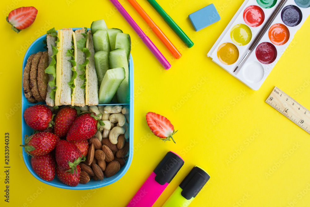 School lunch in the blue box and school stationery on the yellow background. Top view. Copy space.