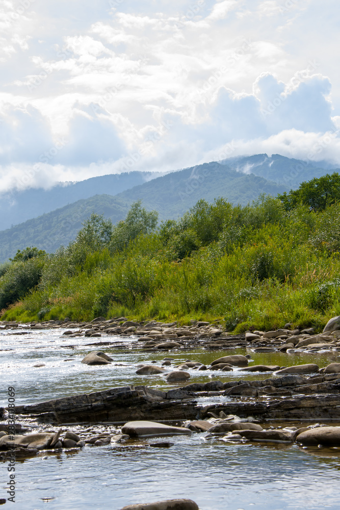 Mountain river with rapids and rifts, slopes with coniferous trees, rocks sticking out of the water