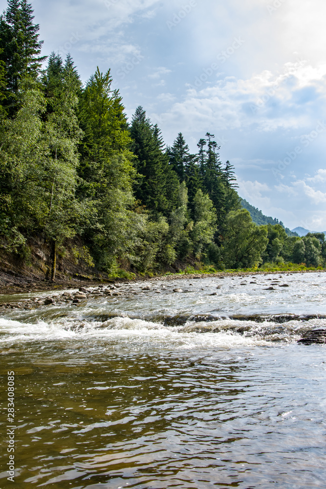 Mountain river with rapids and rifts, slopes with coniferous trees, bubbling stream of water
