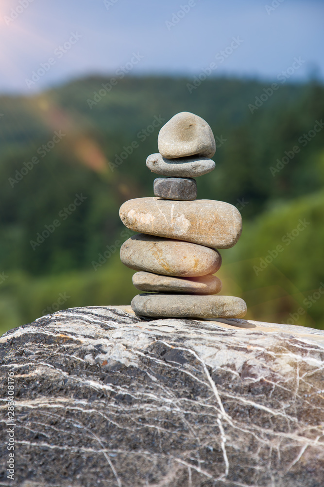 The stones are stacked on top of each other against the background of nature,sun glare and toning