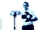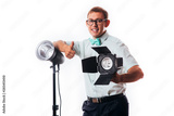 Young pro photographer in his studio setting up lights for the upcoming photoshoot