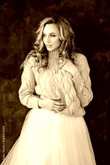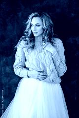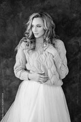 Studio shot of beautiful young woman with blonde hair wearing loose long-sleeved sweater over white dress. Beauty and youth