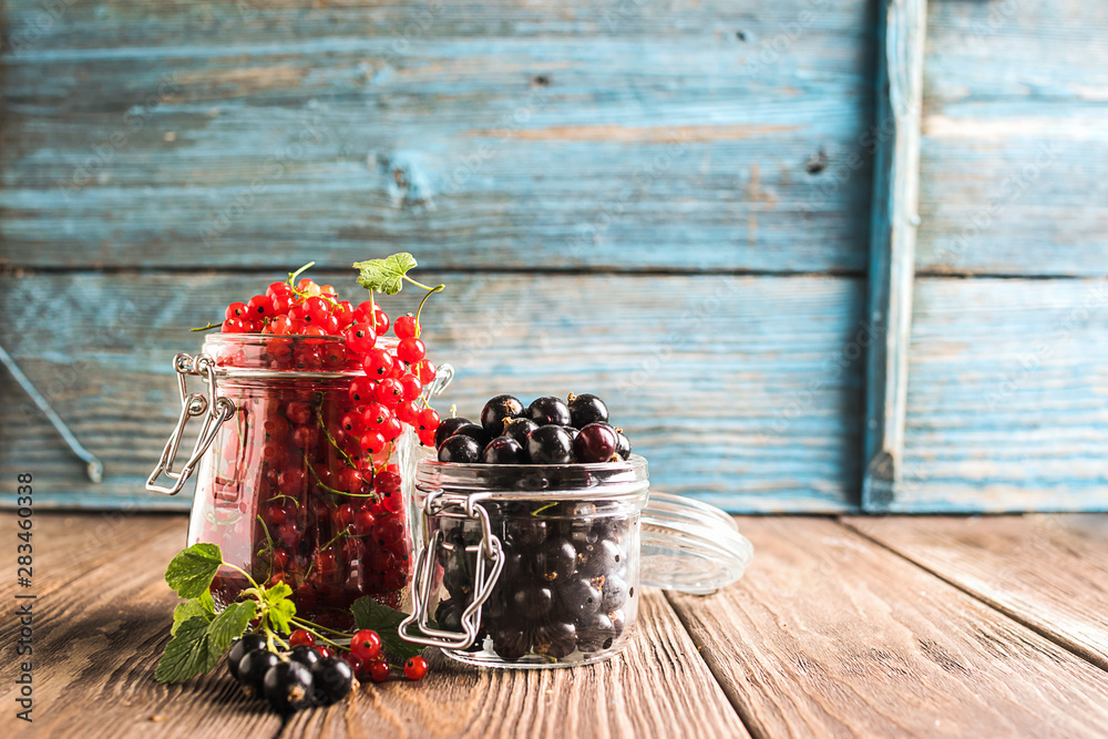 Fresh ripe berries of red black currant various glass jars wooden rustic background. Horizontal frame Selective focus.