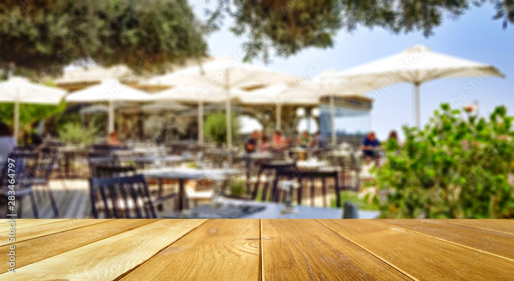 Table background and restaurant outside on sunny day in distance. Empty space for products and decoration.