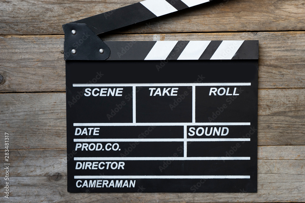 movie clapper on wood table ; film, cinema and vedio photography concept