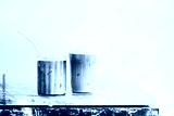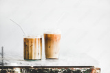 Homemade iced latte coffee in glasses with straws on grey marble table, white wall at background, copy space. Summer cold refreshing drink concept