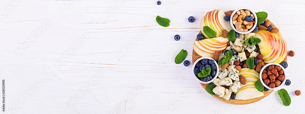 Cheese platter with assorted cheeses, blueberry, apples, nuts on white table. Italian cheese platter and fruit. Banner. Top view, overhead