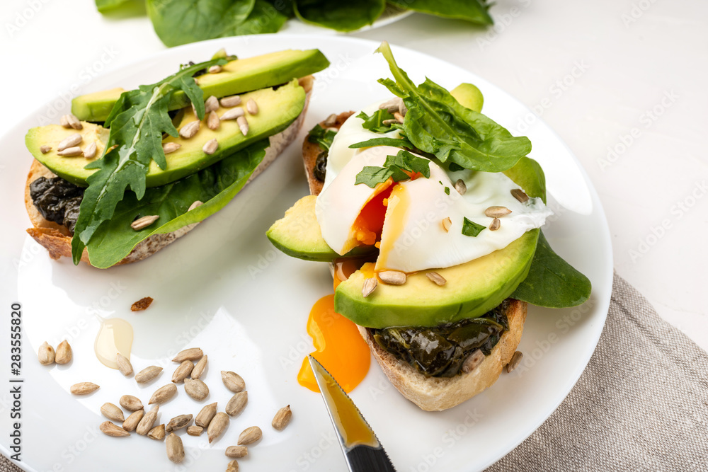 Breakfast. Bread toasts with poached egg and avocado with spinach, fresh arugula and seeds