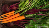 Fresh organic beets and carrots . Summer harvest concept. Top view. Natural style.