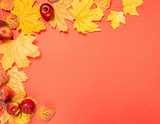 Autumn yellow dry leaves and red apples laid out on a red background. Flat lay. Copy space Autumn concept postcard.