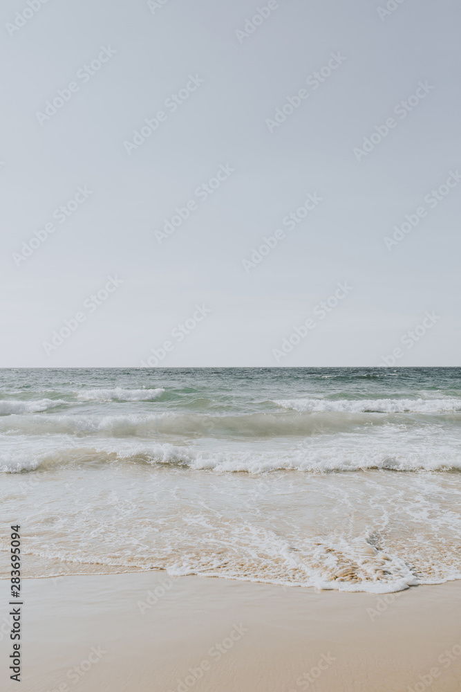 Beautiful tropical beach view with white sand and blue sea with waves on Phuket, Thailand. Minimal composition with neutral colors. Summer concept. Natural background.