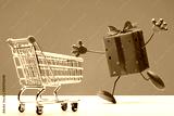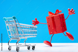Running cheerful gift in red box with legs and hands . Shopping cart on yellow background. Copy space.