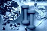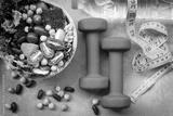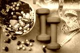 Fresh vegetable salad and healthy food for sport equipment for women diet slimming with measure tap for weight loss on wood background. Healthy Sport Concept.