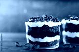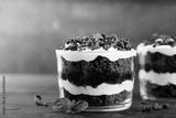 Layered trifle dessert with chocolate sponge cake, whipped cream and fruit jelly in serving glasses.