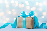 Christmas gift box or present box with beautiful blue ribbon against holiday lights background.