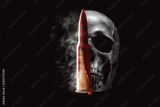 Human skull, bullet, blood and smoke on black background. Crime, war concept.