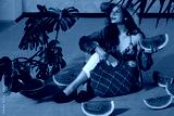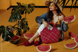 Full body summer fashion portrait of young beautiful happy smiling woman wearing straw hat, pink loafers, yellow sunglasses, holding watermelon slice. Copy, empty space for text