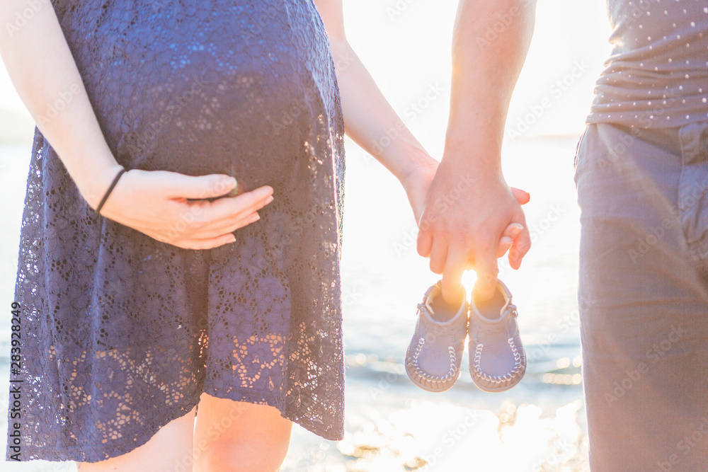 pregnant couple on the beach at sunset. pregnant girl posing with her husband against the background of a beautiful sunset during the blue hour. waiting for the baby.