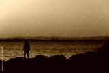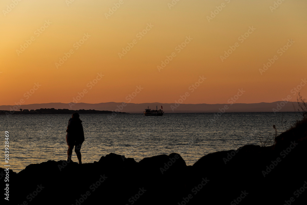loving couple boy and girl kissing at sunset. a beautiful sunset or sunrise with a ship on the horizon.