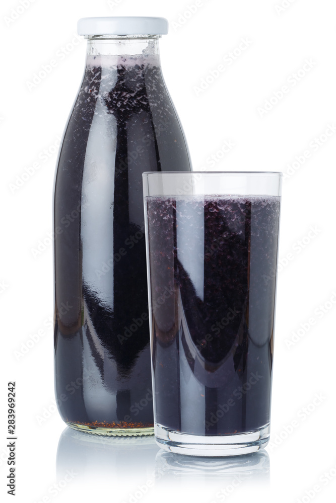 Fresh blueberry smoothie fruit juice drink blueberries in a bottle and glass isolated on white