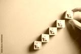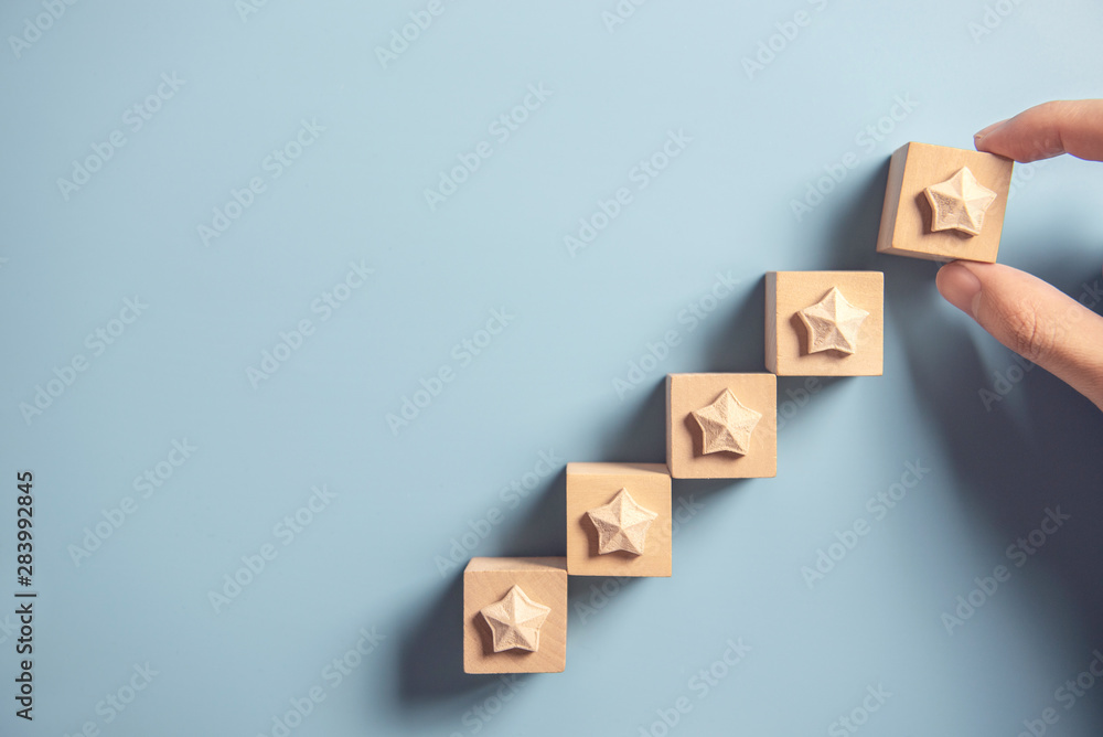 Best Excellent Services Rating for Satisfaction, Online feedback quality customer review, Woman Hand putting wooden five star shape on blue background.