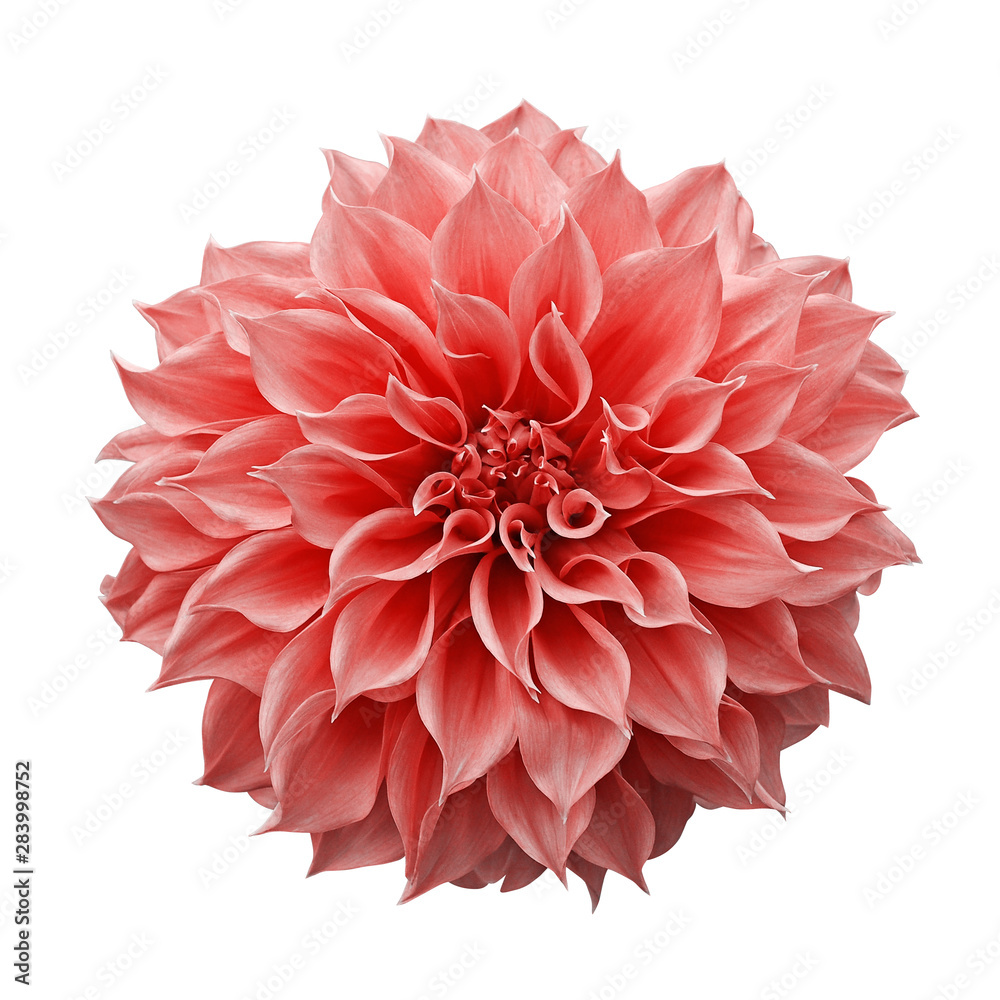 Trendy pink-orange or coral colored Dahlia flower the tuberous garden plant isolated on white background with clipping path.