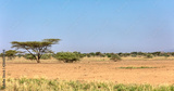 Panorama of Awash national park landscape with acacia tree in front and mountain in background