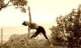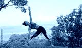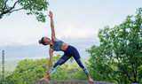 Young woman practicing yoga on stone outdoors harmony with nature.