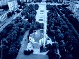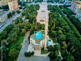 UST-KAMENOGORSK, KAZAKHSTAN (QAZAQSTAN) - August 08, 2019: Beautiful panoramic aerial drone view to Central City Mosque in Oskemen
