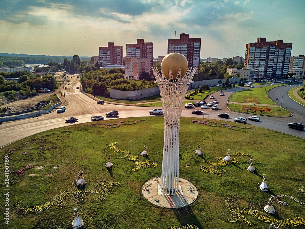 UST-KAMENOGORSK, KAZAKHSTAN (QAZAQSTAN) - August 08, 2019: Beautiful panoramic aerial drone view to Baiterek (Bayterek) Tower - symbol Kazakh's people freedom - in Oskemen