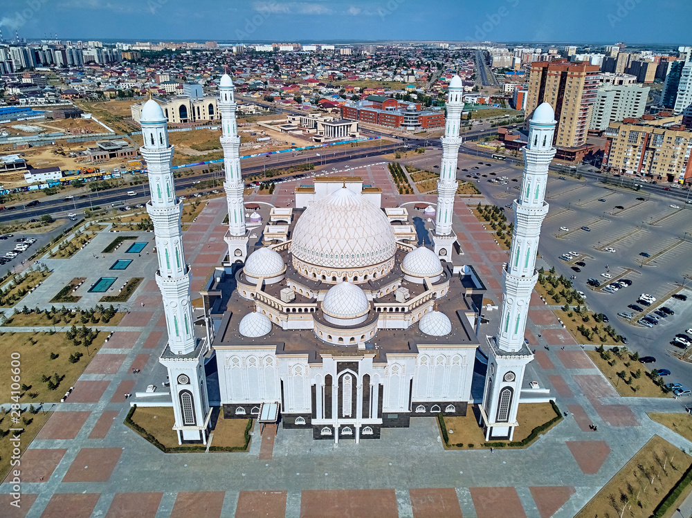 NUR-SULTAN, KAZAKHSTAN - August 11, 2019: Beautiful panoramic aerial drone view to Nursultan (Astana) city center with skyscrapers and Hazrat Sultan Mosque