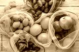 fruits and vegetables in reusable eco bags at white wooden background. Recycled bags instead of plastic bags. Plastic free. Top view flat lay