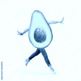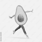 Good nutrition for your body. Avocado as a human body on coral background. Negative space to insert your text. Modern design. Contemporary art collage. Concept of healthy lifestyle, eating, food.