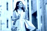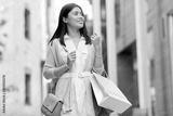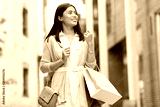 sale, consumerism and people concept - young asian woman with shopping bags walking along city street