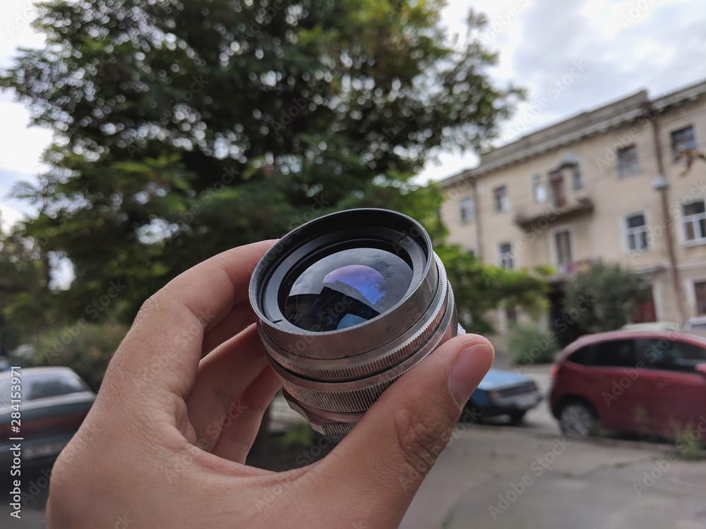 retro lens for a photo camera in the hands of a photographer
