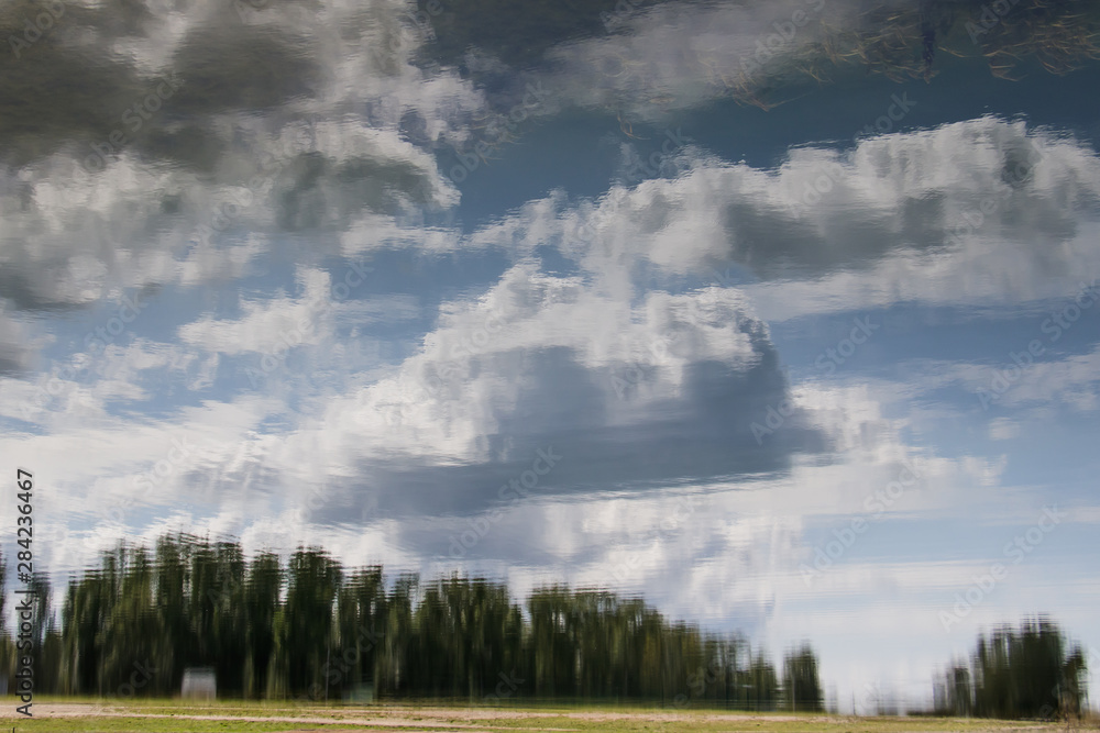 Landscape. Reflection on a smooth river surface of trees, blue sky and clouds.