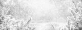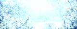 Blue winter christmas nature background frame, wide format. Snow-covered fir branches, snowdrift against snowfall in forest . Close-up, copy space.