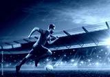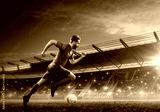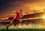 Soccer player in action on a stadium. Dribble the ball. Soccer game. Sports championship. Soccer field.