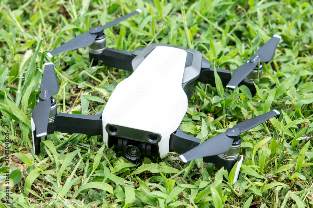 Foldable professional drone with camera in the grass
