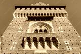 Sforza Castle close-up, Milan, Italy. It is a famous landmark of the city. Bottom view of main tower in summer. Renaissance architecture in the Milan center. Medieval decoration of old Sforza Castle.