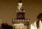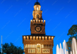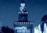 Sforza Castle and beautiful fountain at night, Milan, Italy. This castle was built by Sforza, Duke of Milan. It is a famous landmark of Milan. Old architecture and tourist place in Milan at dusk.