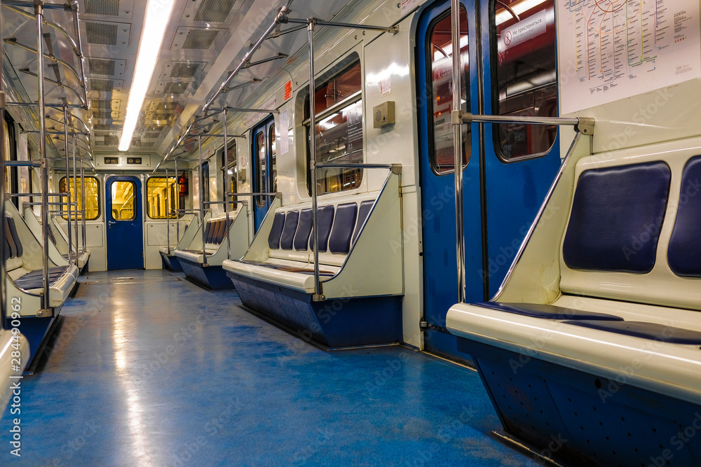 Moscow, Russia - August, 8, 2019: interior of Moscow subway carriage.