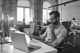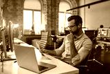 Analyzing data. Side view of concentrated bearded man in eyeglasses and formal wear looking at documents and touching his chin while sitting in the modern office