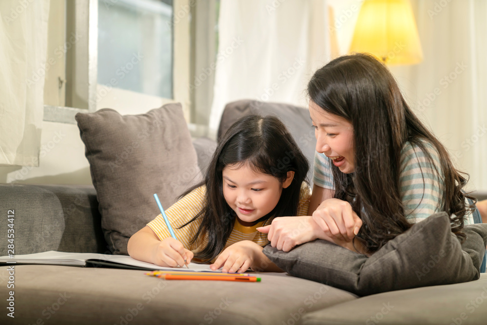 happiness asian family mom teach homework together with daughter on sofa relax and casual study home background