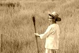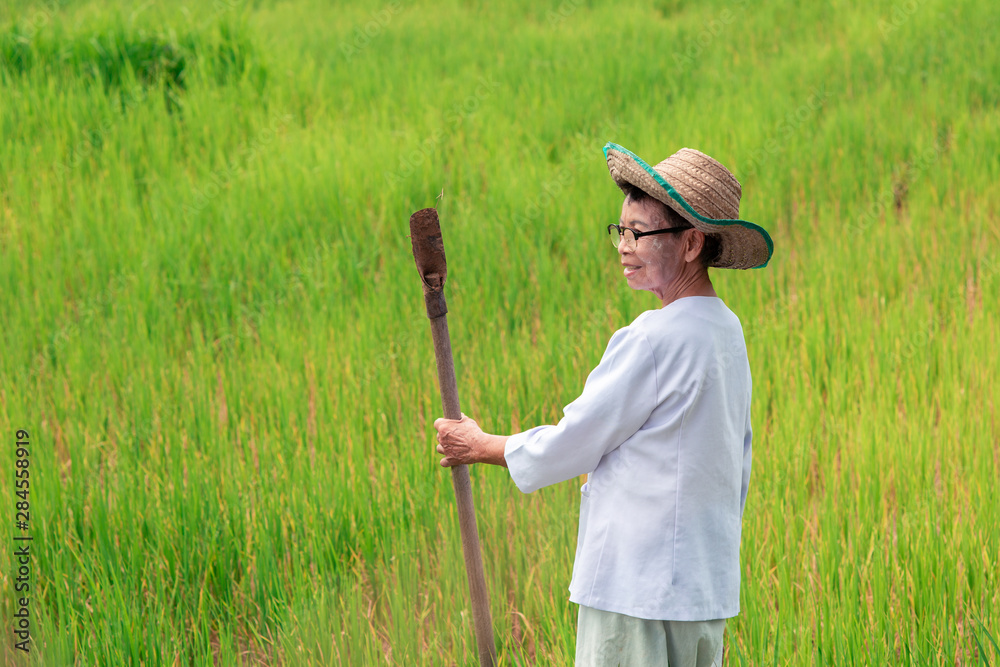 Beautiful portrait of smile asian farmer elderly woman with agricultural tools