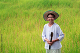 Beautiful portrait of smile asian farmer elderly woman with agricultural tools