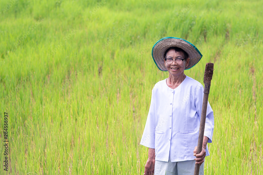 Beautiful portrait of smile asian farmer elderly woman with agricultural tools